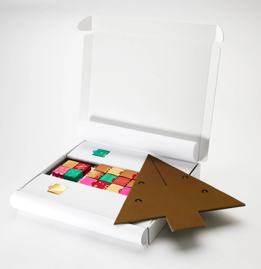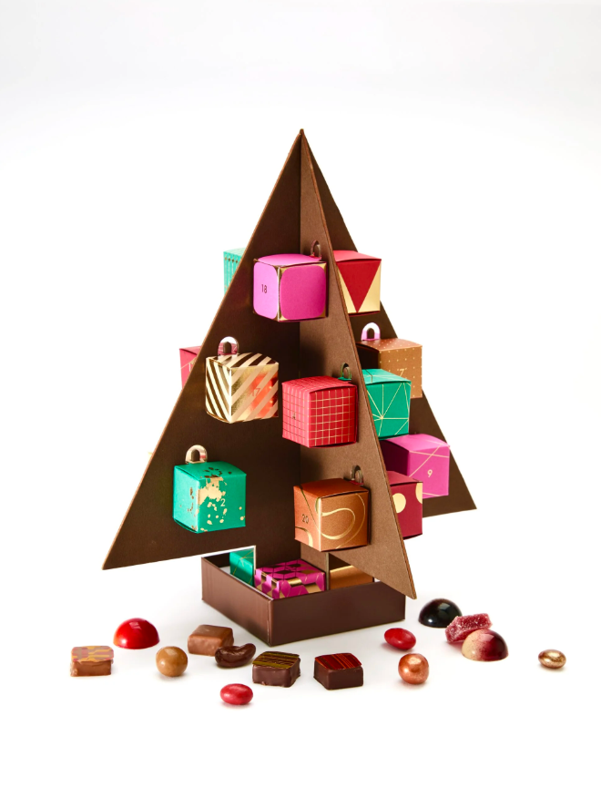 Julekalenderen er formet som et juletre og kommer med 24 pakker fylt med to spennende fristelser.
