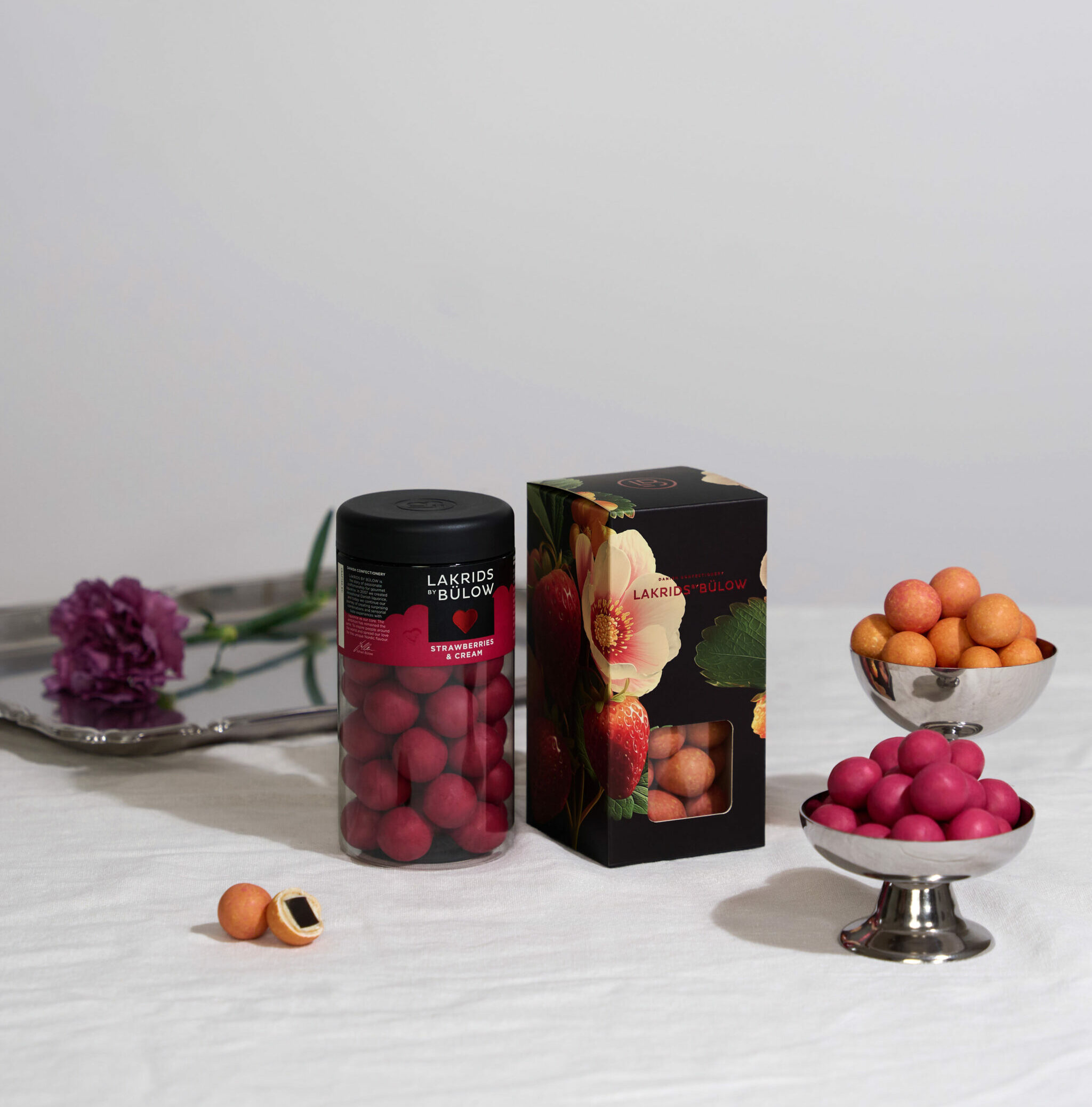 En synergi mellom skarpe røde jordbær, hvit myk krem og søte lakris. Eksklusiv hvit sjokolade bringer det hele sammen, og den friske og tilfredsstillende foreningen gir deg en smak av ekte dansk kjærlighet.